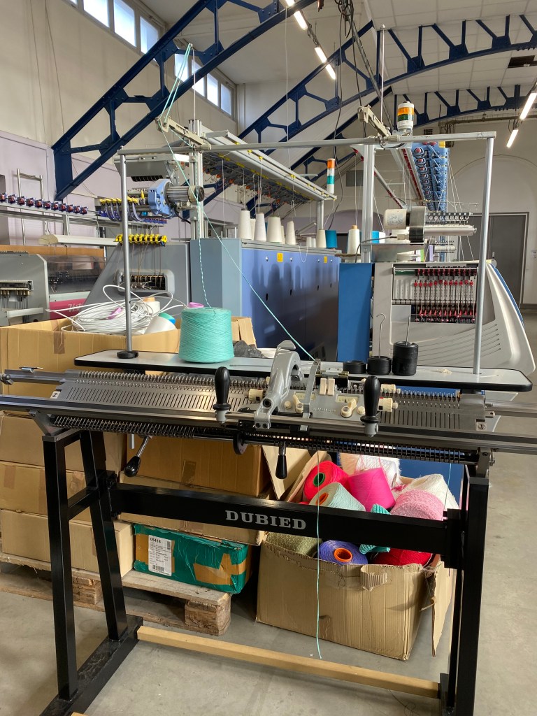 Notre troisième atelier de la journée : celui de tricotage ! Bien loin de ce qu’on pu nous apprendre nos grands-mères au coin du feu, nous avons face à nous des machines de plusieurs mètres de long avec des centaines d’aiguilles, toutes synchronisées, qui dans un mouvement uniforme créent sous nos yeux des pièces de tricot. La maille c’est une aiguille + un fil, mais c’est surtout une technique et une programmation pour atteindre le résultat escompté, comme celui d’un gant sans la moindre couture. Au-delà de l’esthétique, c’est toute la technique des ingénieurs textiles qui est mise en avant au travers de ce type de créations.