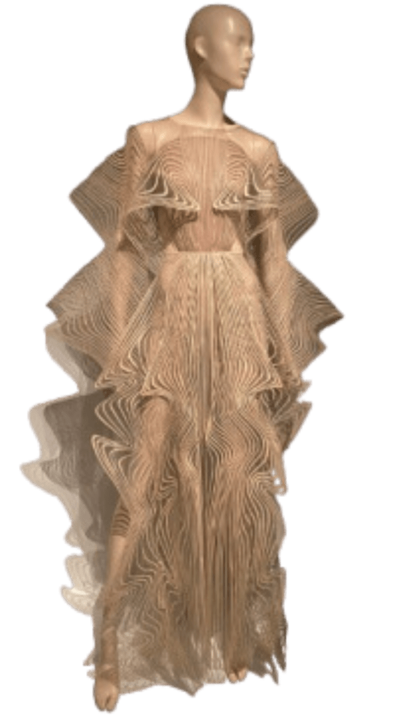 La couture d’Iris Van Herpen est souvent qualifiée de futuriste. En effet, elle présente un monde de nature imaginaire, un monde de demain, tout en s’inspirant de notre société actuelle obnubilée par le virtuel. Les collections “Escapism”, “Voltage” et “Syntopia” font le lien entre la technologie, les sciences et autres disciplines. Le vêtement vient métamorphoser le corps qui le porte. Ainsi, la mode dispose d’une toute nouvelle définition.