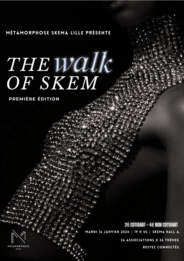 Le Walk Of Skem, nouvel évènement depuis janvier 2023, est un défilé inter-associations où les membres de chaque association du campus lillois de SKEMA créent leurs propres tenues en fonction d’un thème donné par Métamorphose, pour tenter de remporter la compétition.